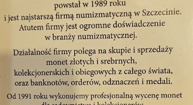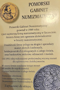 Pomorski Gabinet Numizmatyczny to renomowany sklep numizmatyczny w Szczecinie, który od lat wspiera kolekcjonerów. Oferujemy kompleksowe usługi z zakresu numizmatyki, łącząc wiedzę, pasję i wieloletnie doświadczenie. Jeśli interesuje Cię kolekcjonowanie monet, banknotów lub potrzebujesz fachowej i rzetelnej wyceny, jesteśmy do Twojej dyspozycji. W naszej ofercie znajdziesz unikalne monety kolekcjonerskie, a także możliwość skupu numizmatów na atrakcyjnych i uczciwych warunkach. Każda wycena monet lub innych antyków wykonywana jest z dbałością o szczegóły oraz realia rynkowe, co gwarantuje wiarygodną ocenę wartości. Zapraszamy do odwiedzenia Pomorskiego Gabinetu Numizmatycznego w Szczecinie i dołączenia do grona zadowolonych klientów!